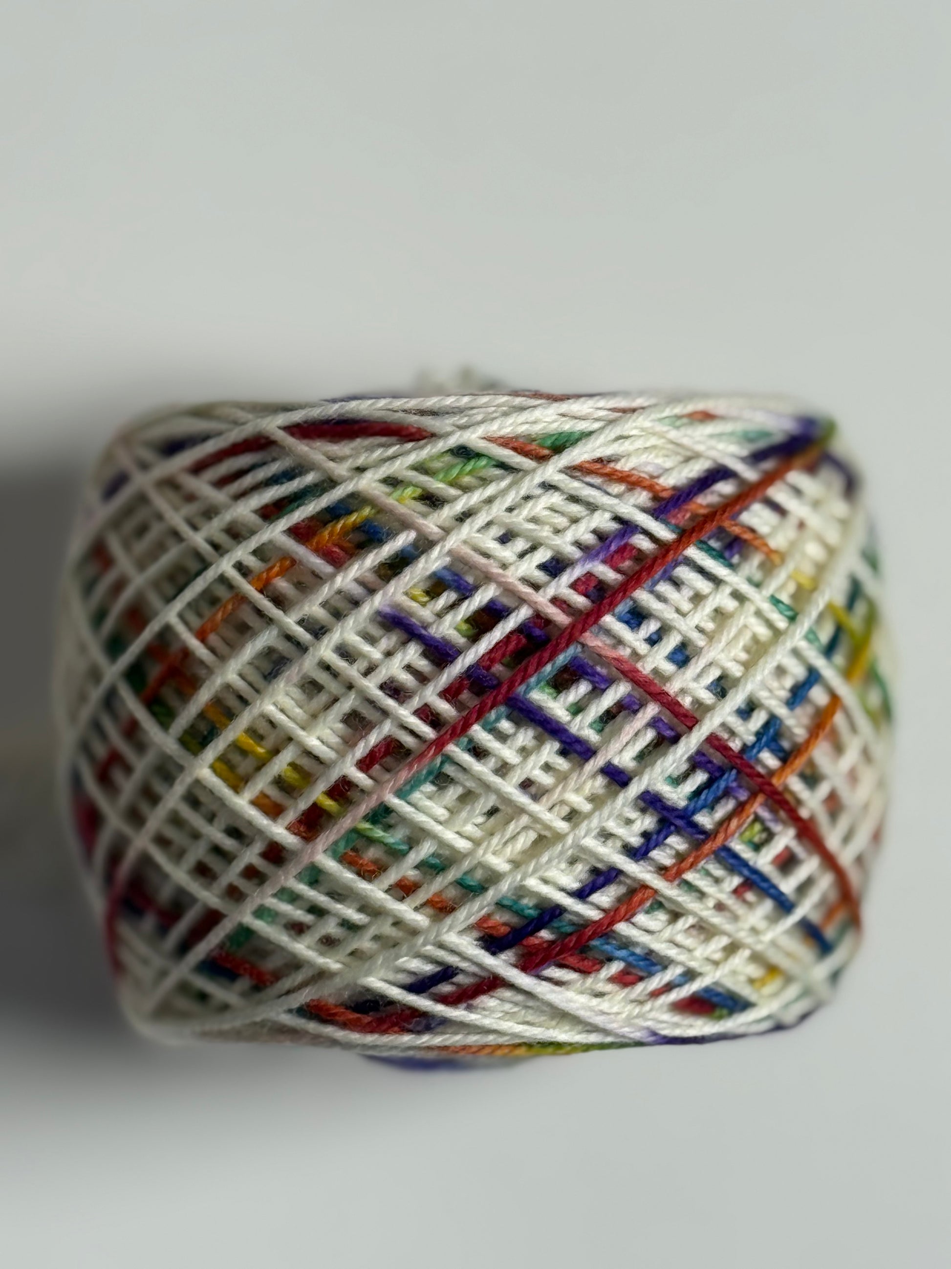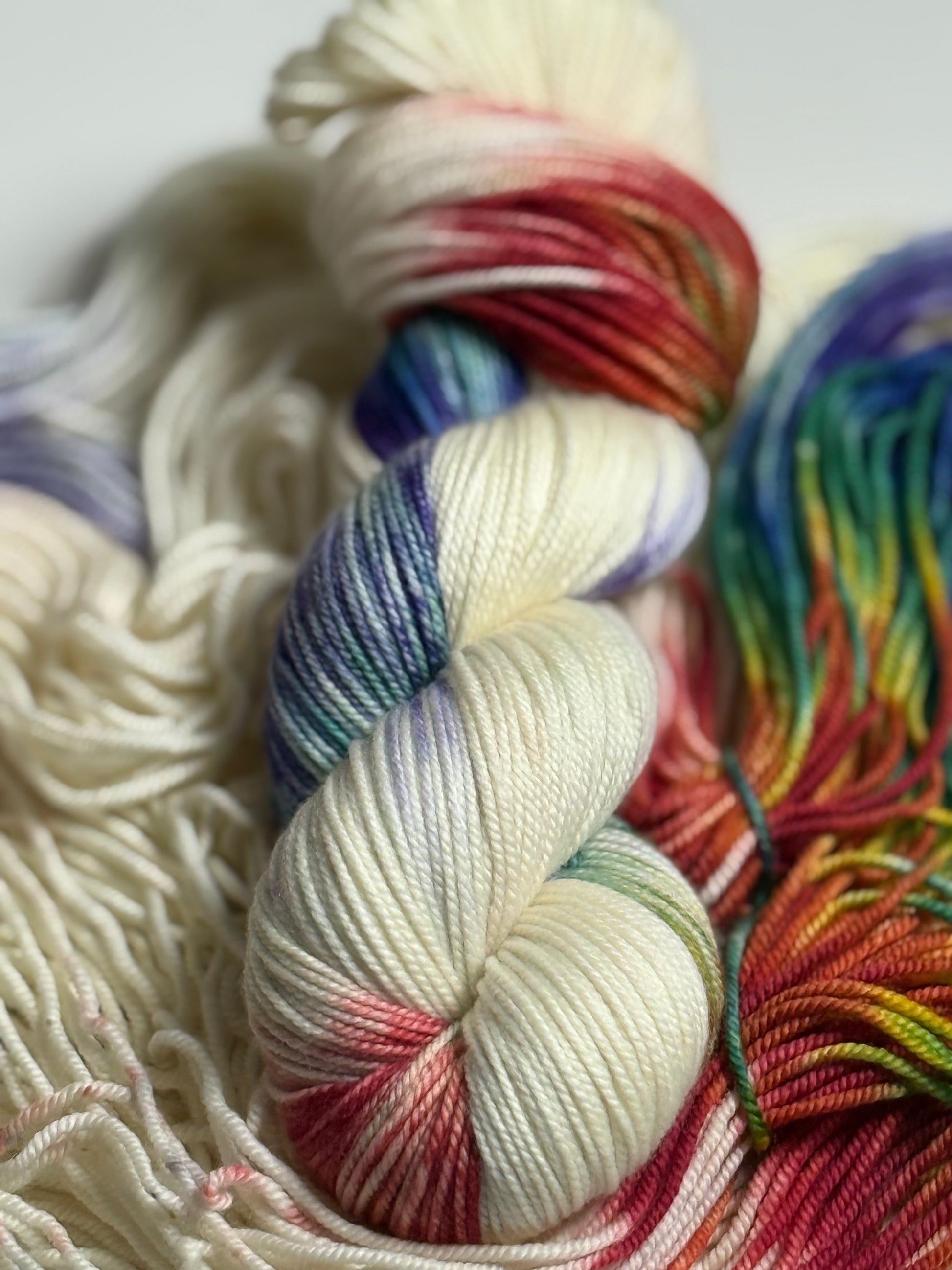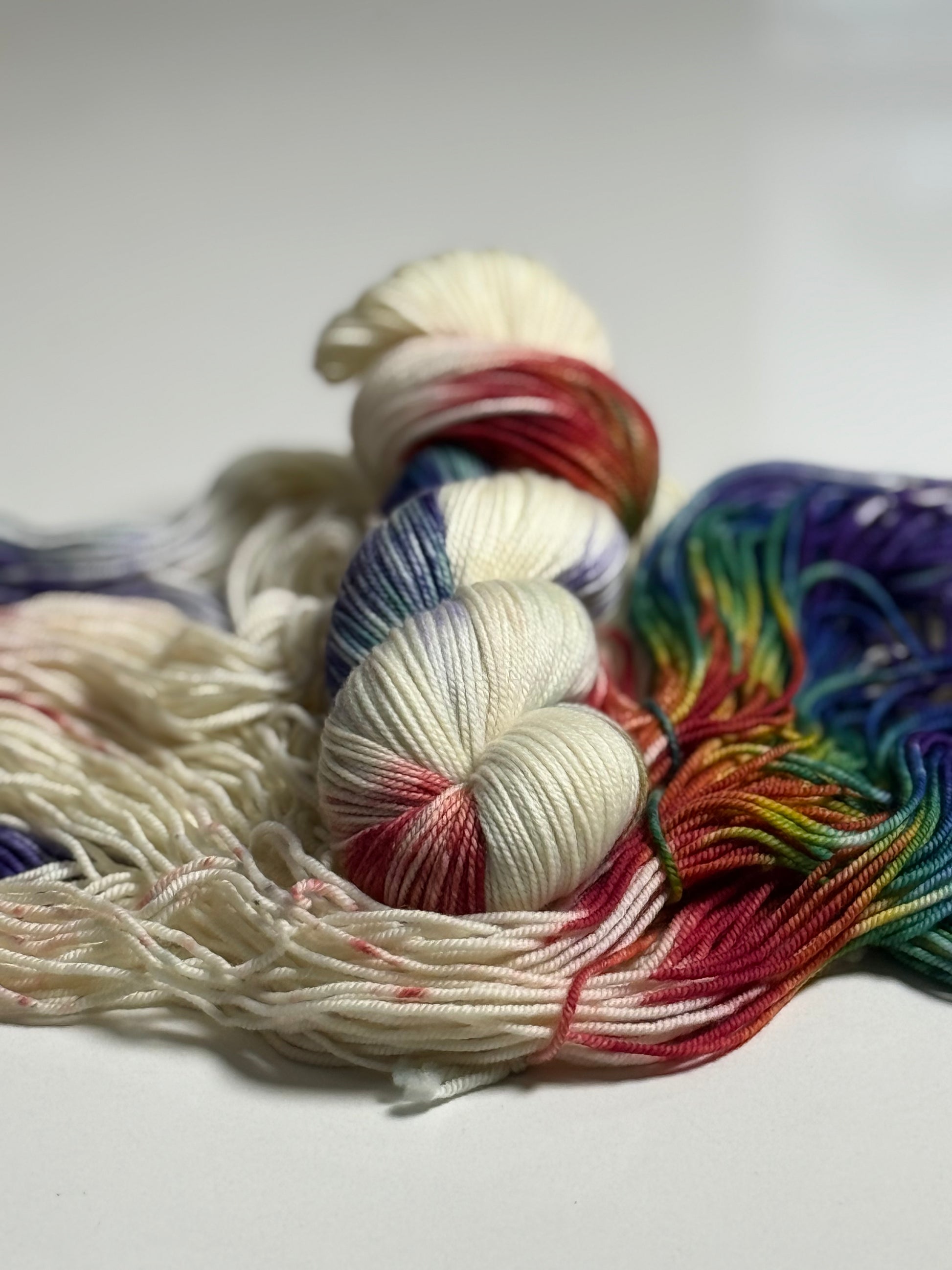 Ivory like clean paper stretches wide, waiting. Then comes the rush — firetruck red, ocean blue, grass green, sunshine yellow, electric violet — streaking across the skein like a child who couldn’t possibly pick just one color. And why would they?