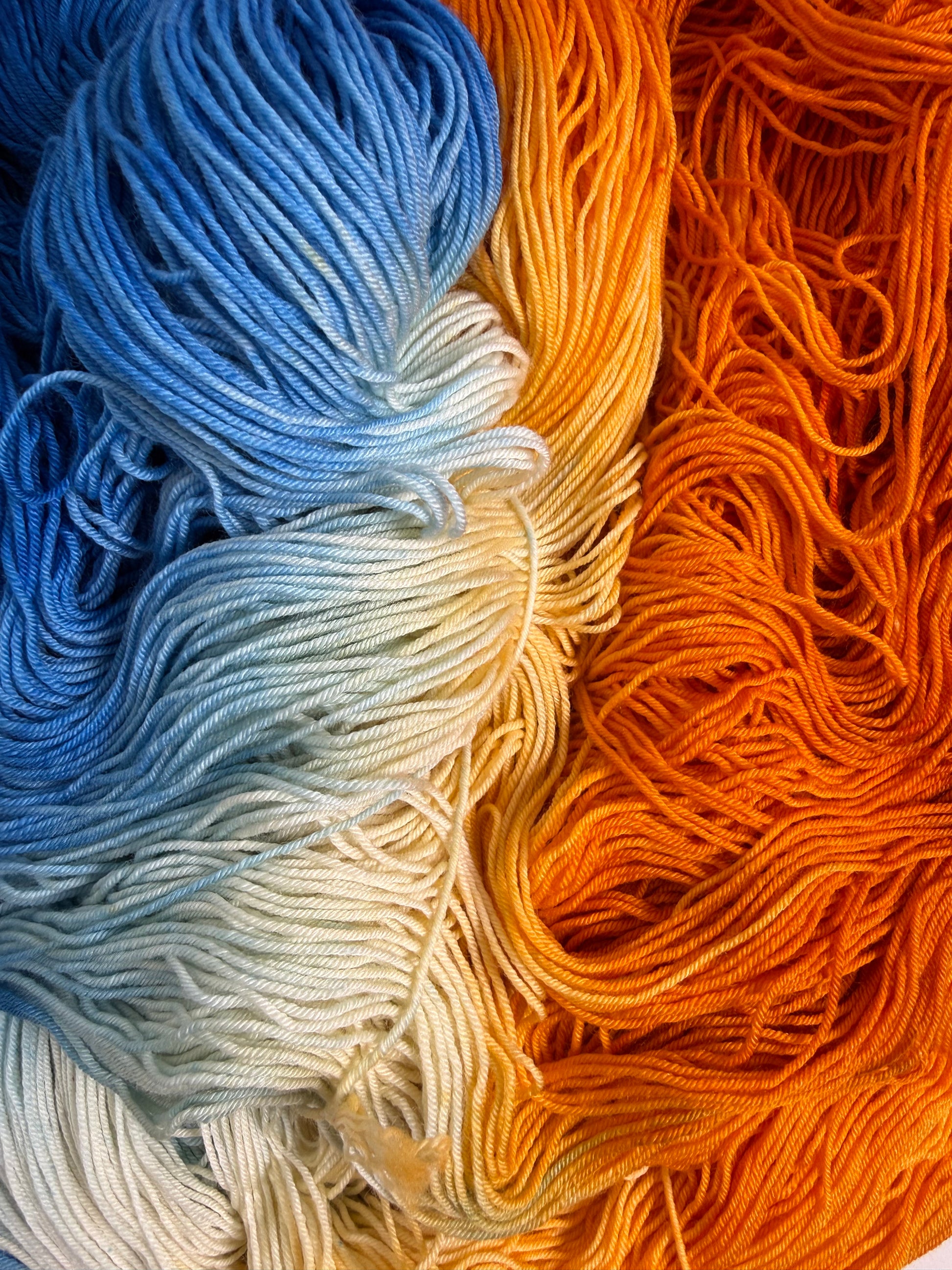 Hand dyed in small batches, each skein shifts from cool to heat with natural variation — no two horizons ever exactly the same.