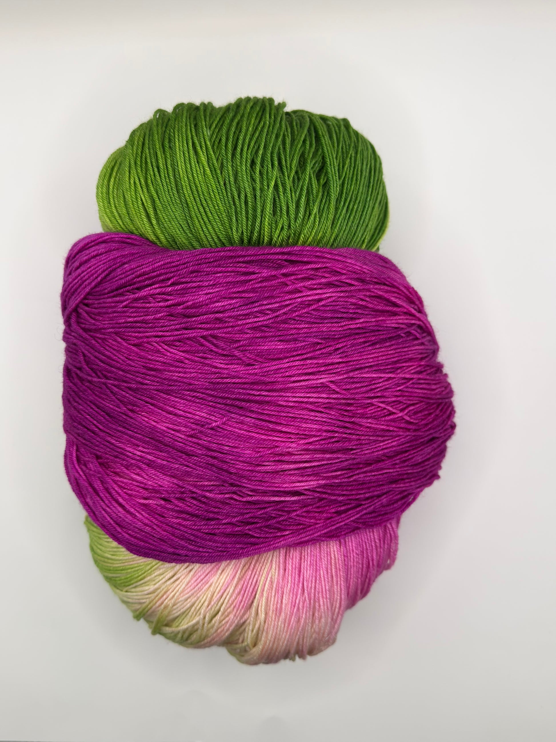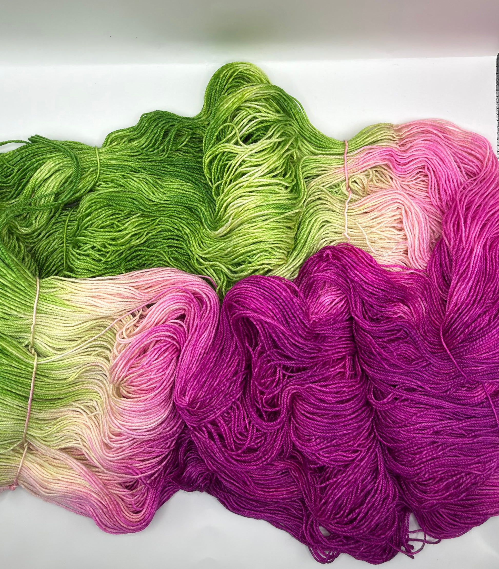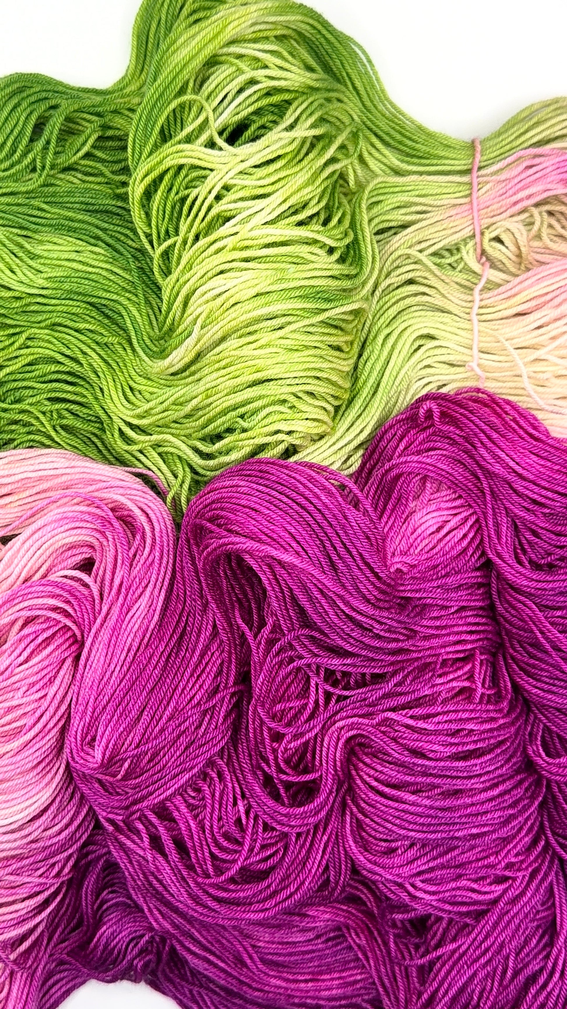 Fresh Cut is bright and sharp, like green stems snapped in the morning and petals scattered where they fall. Crisp lime melts into soft blush and bursts of bold pink, alive with that just-picked energy. It feels new, a little wild, and impossible to tame. Hand-dyed in small batches, each skein carries that same freshly gathered chaos—vivid, raw, and full of life.