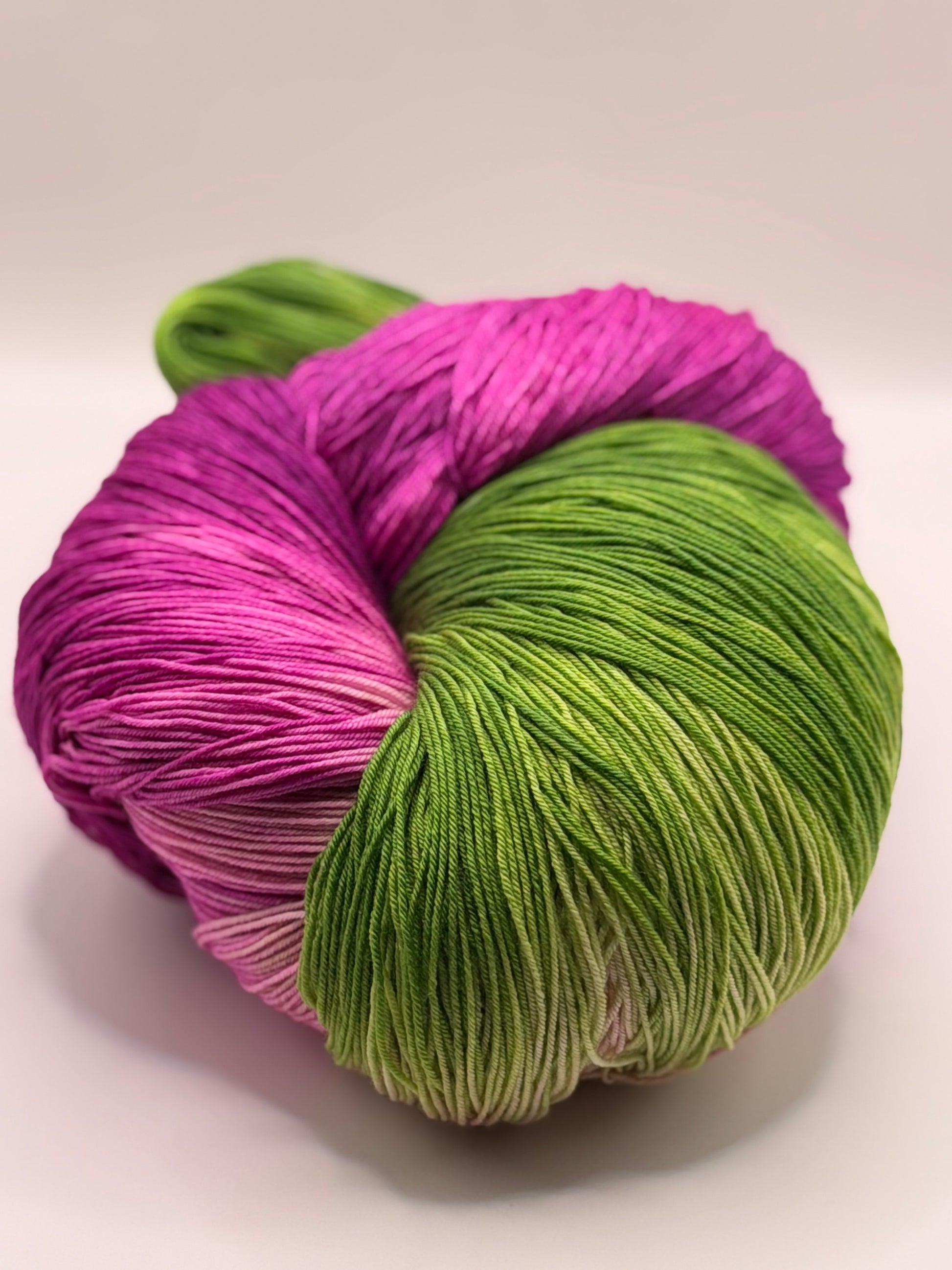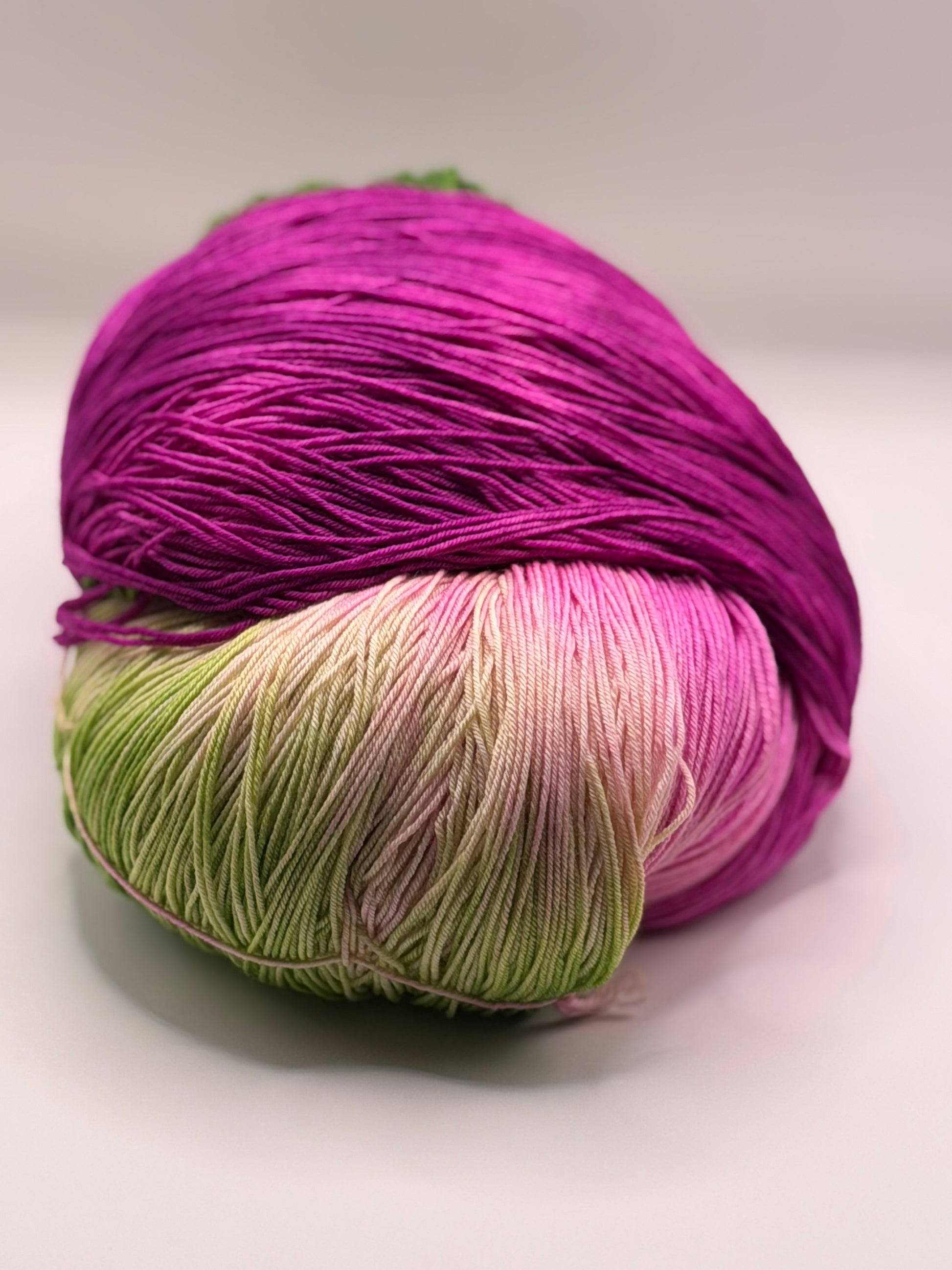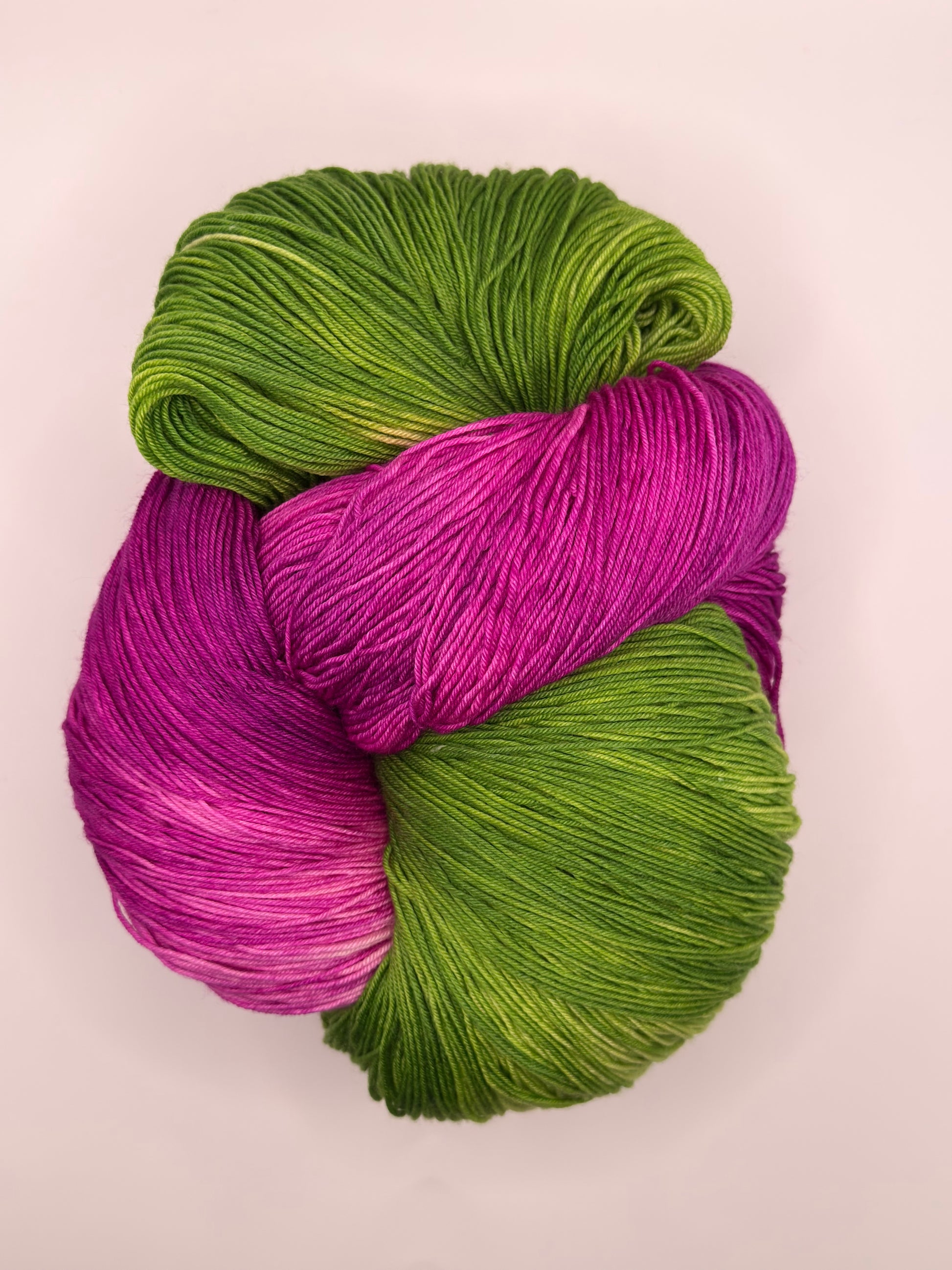 Fresh Cut is bright and sharp, like green stems snapped in the morning and petals scattered where they fall. Crisp lime melts into soft blush and bursts of bold pink, alive with that just-picked energy. It feels new, a little wild, and impossible to tame. Hand-dyed in small batches, each skein carries that same freshly gathered chaos—vivid, raw, and full of life.