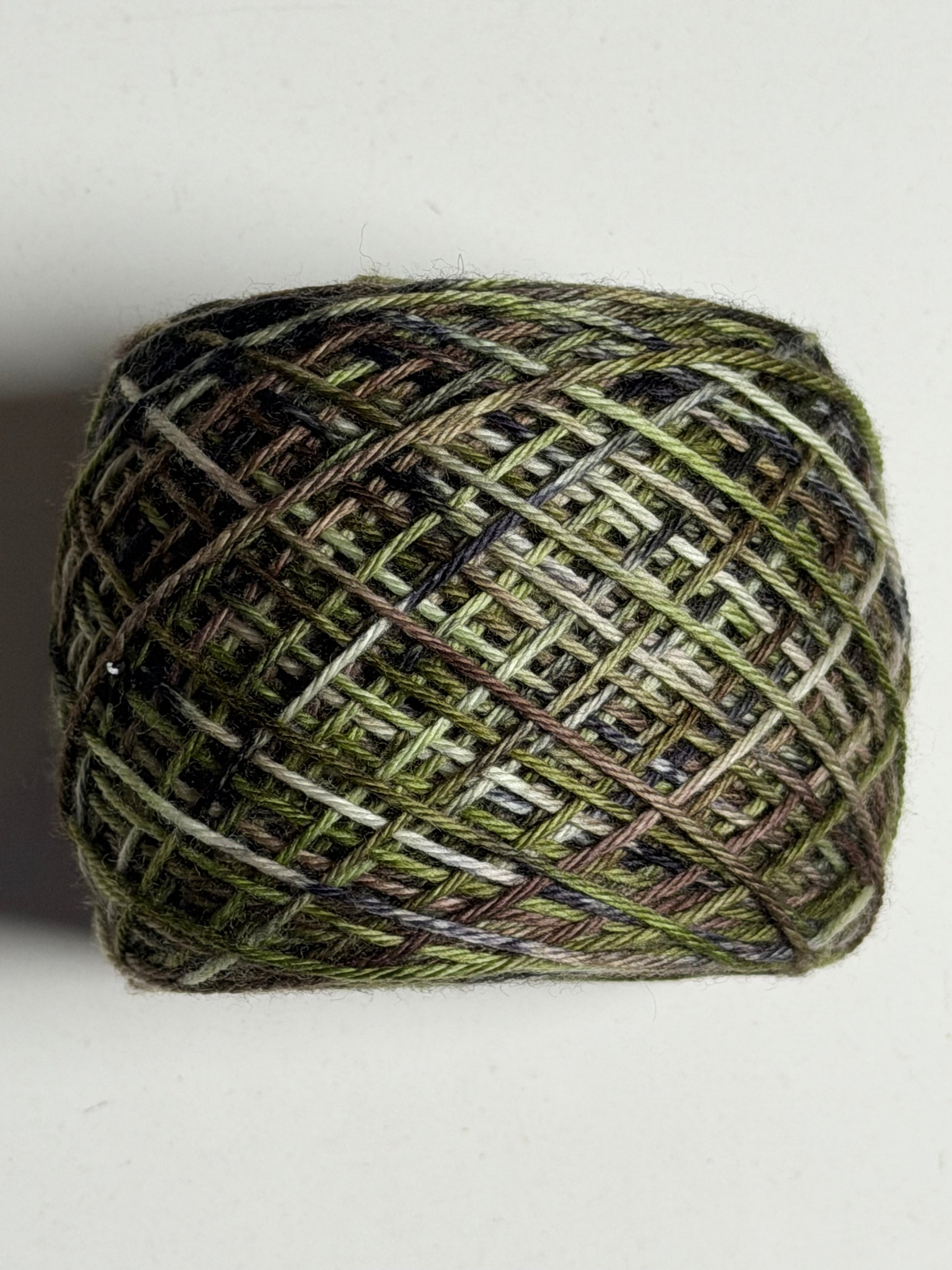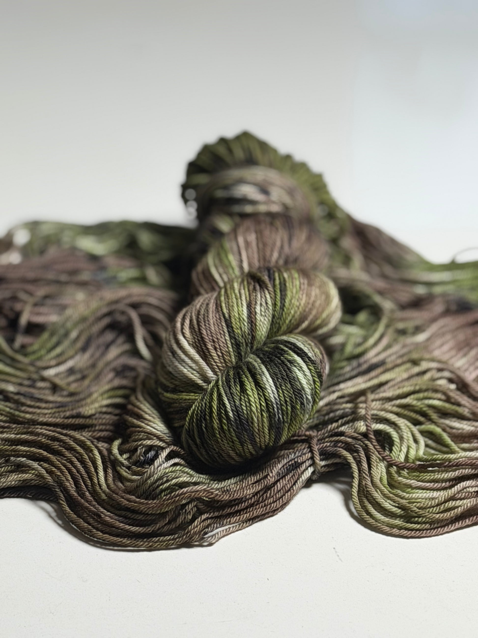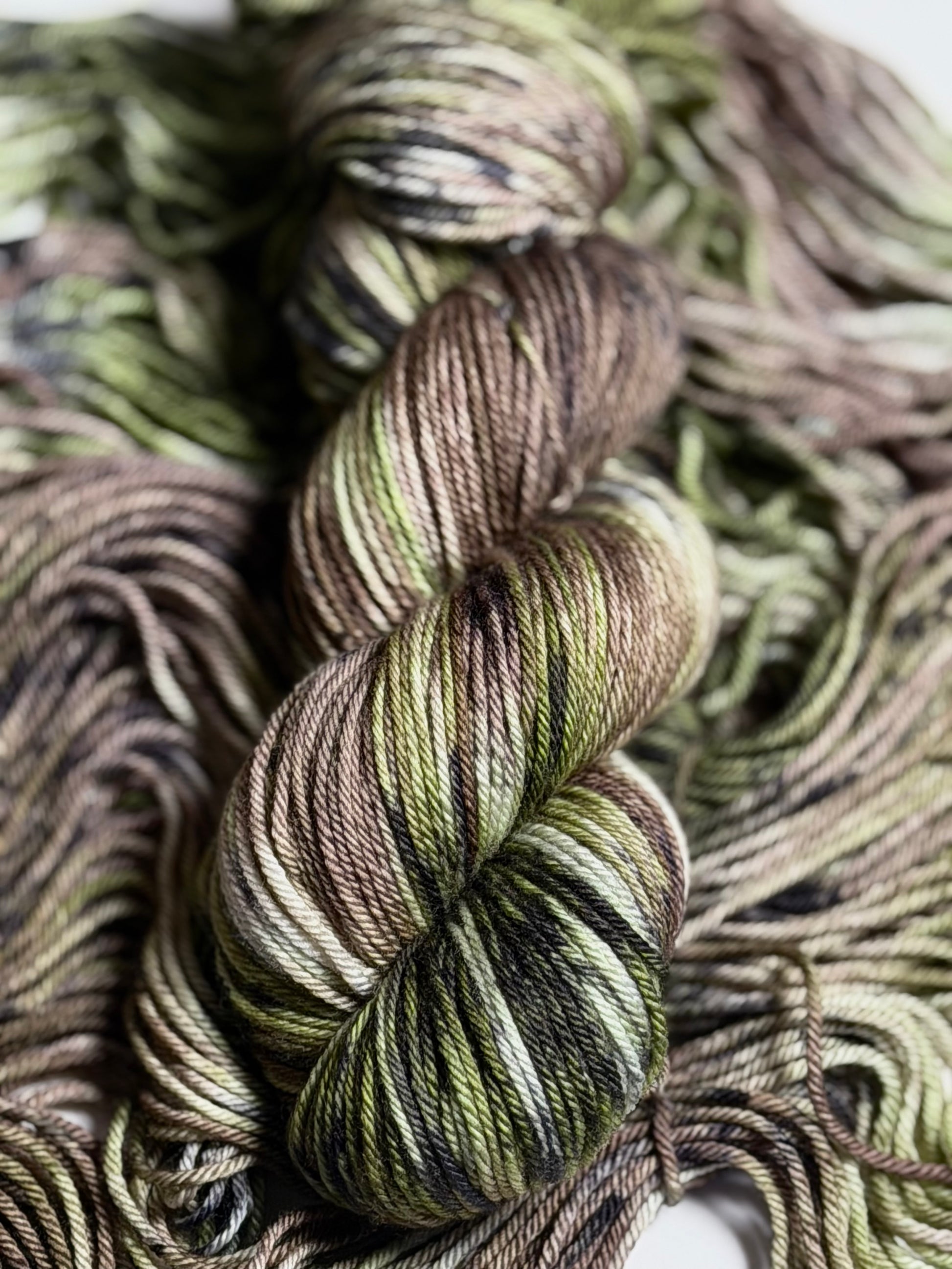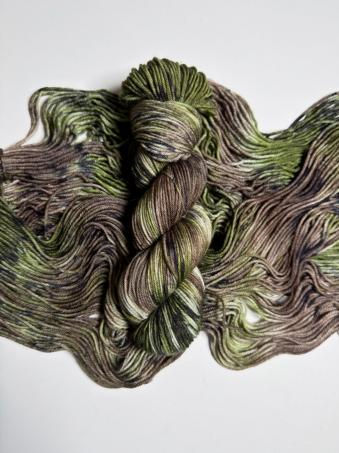 Frontlines is where earth meets endurance—deep olive, weathered brown, and shadowed undertones blending like terrain worn by time and movement. It tells the story of grit and quiet strength, of standing firm no matter the conditions. Hand dyed in small batches, this colorway carries the spirit of resilience in every stitch.