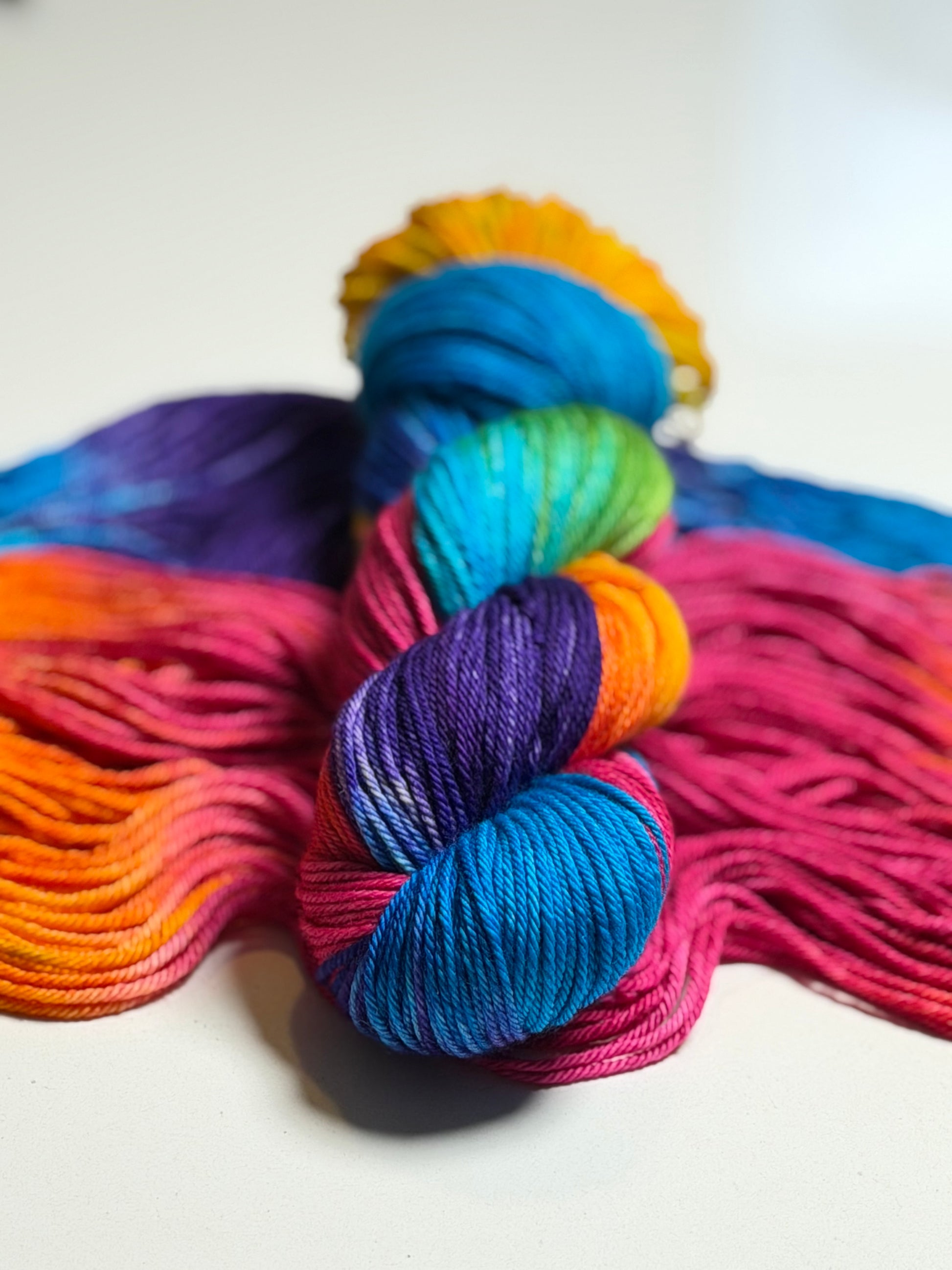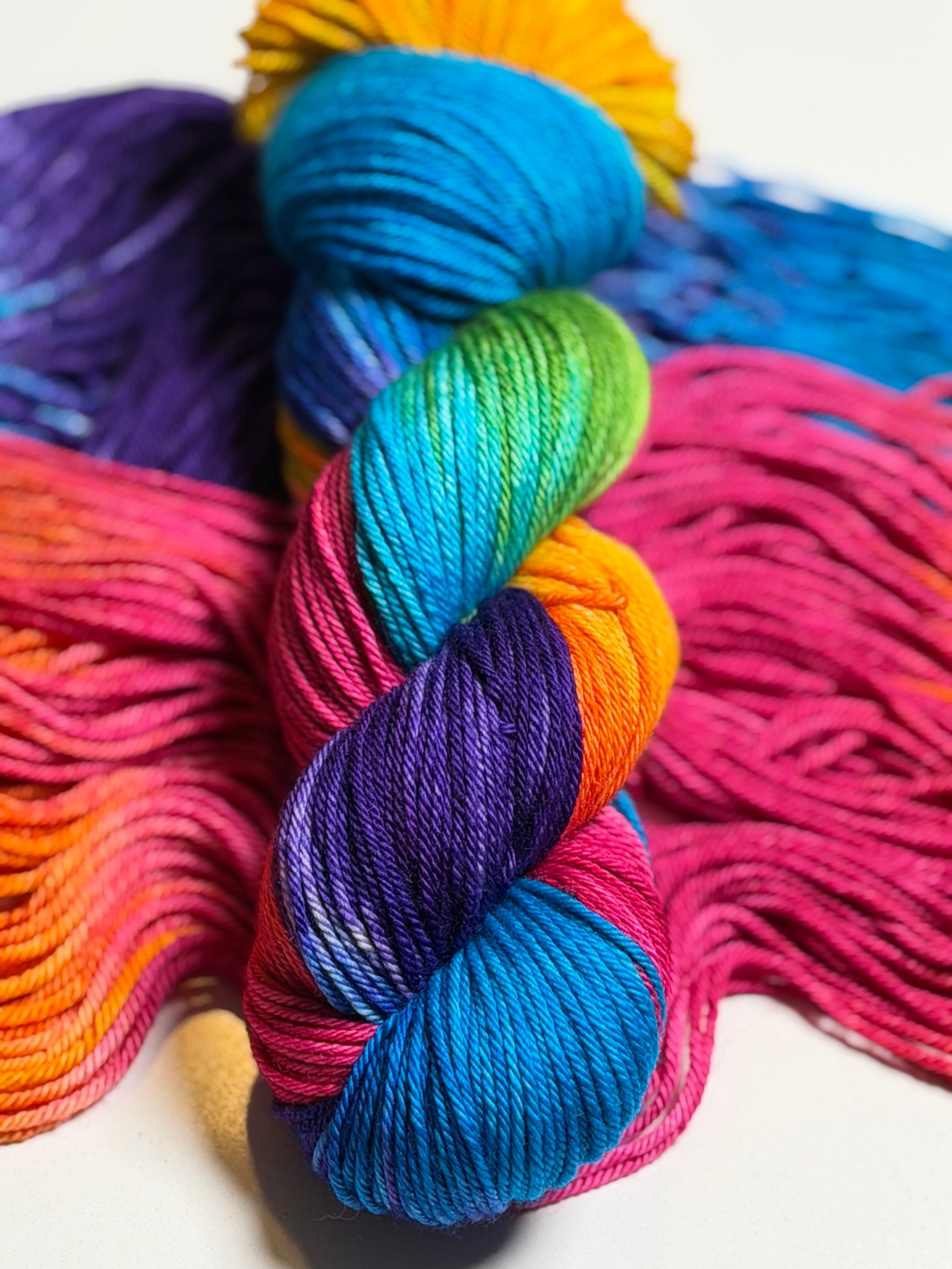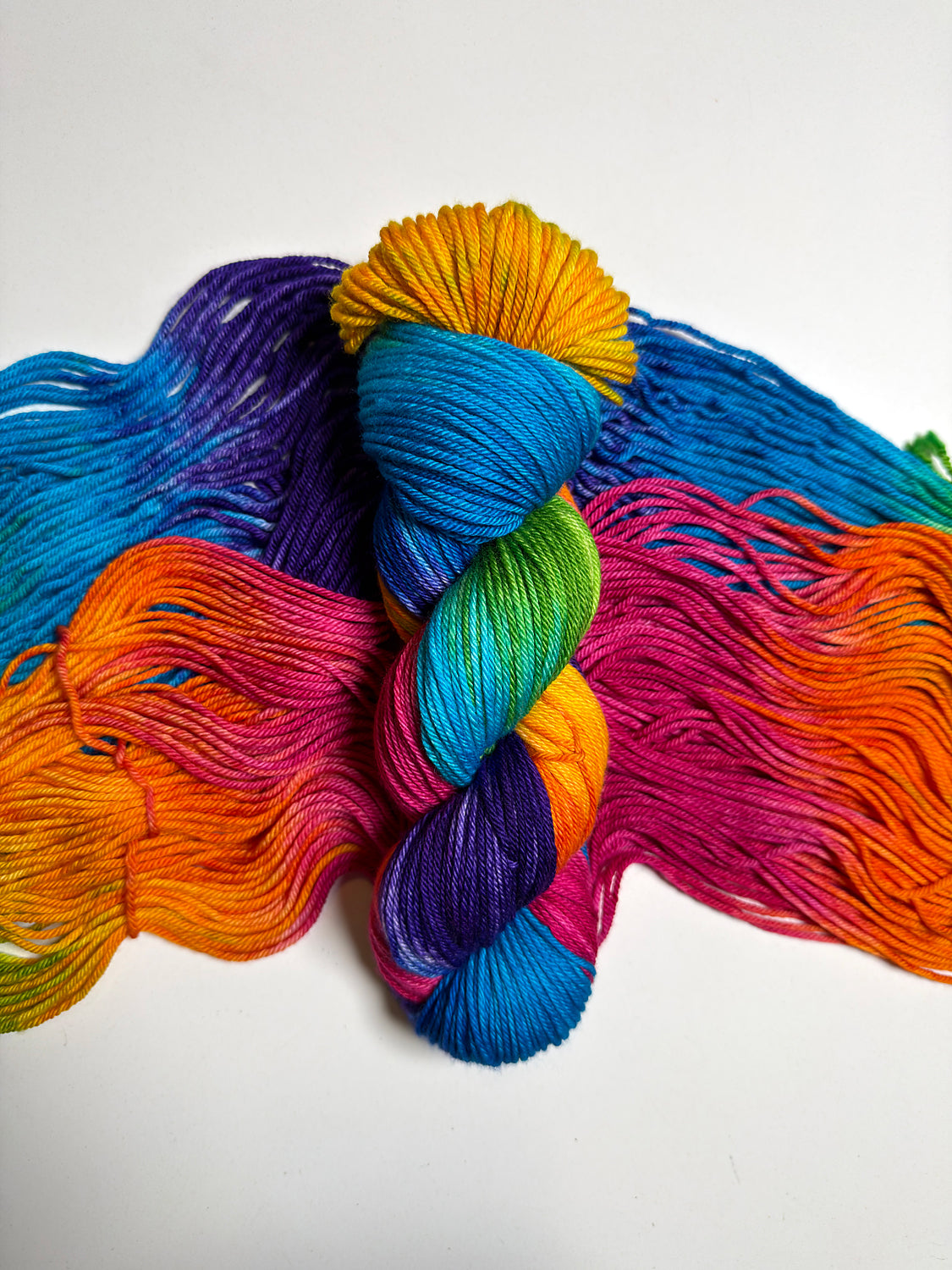 Full Send doesn’t hold back—electric color colliding in every direction like a moment you didn’t think twice about. Loud, chaotic, and impossible to ignore, this is pure adrenaline in yarn form—hand dyed in small batches for when you’re all in, no hesitation.