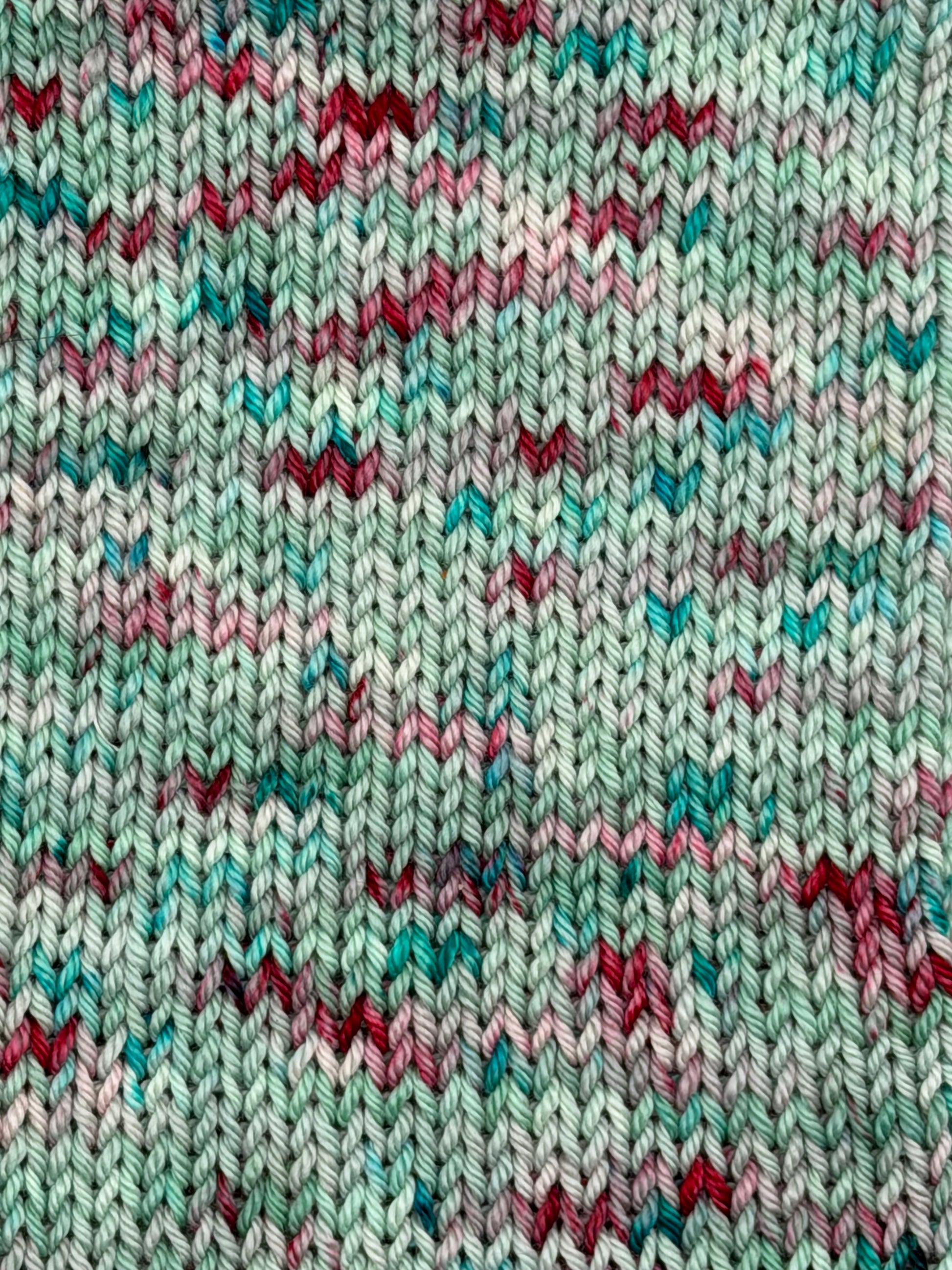 Fresh and cool, Mint Condition starts with a soft minty base kissed with speckles of teal and deep berry red. The colors scatter across the yarn like tiny bursts of contrast, giving the skein a crisp, lively energy that feels both playful and refined.