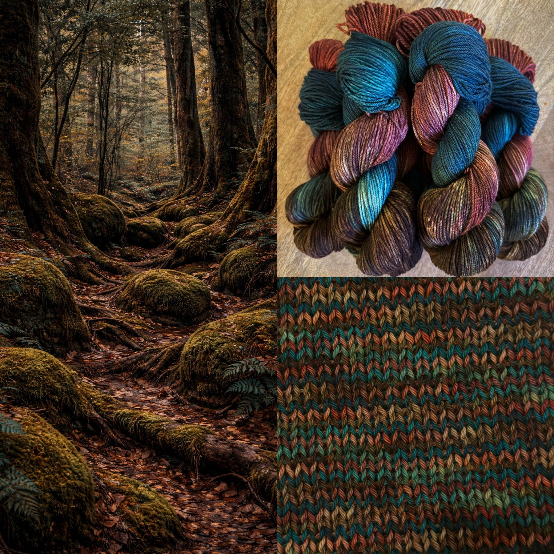 Envision a journey through a deep, ancient forest during the height of autumn, where every hue captures a moment of dramatic beauty. The colors plunge from the rich, aged burgundy of fallen leaves into the mysterious, deep teal of hidden springs and forest shadows. As the light catches the fibers, it transitions into the warm, earthy browns of damp soil and the surprising shimmer of golden embers, evoking a sense of cozy mystery and wild exploration in a single, flowing skein.