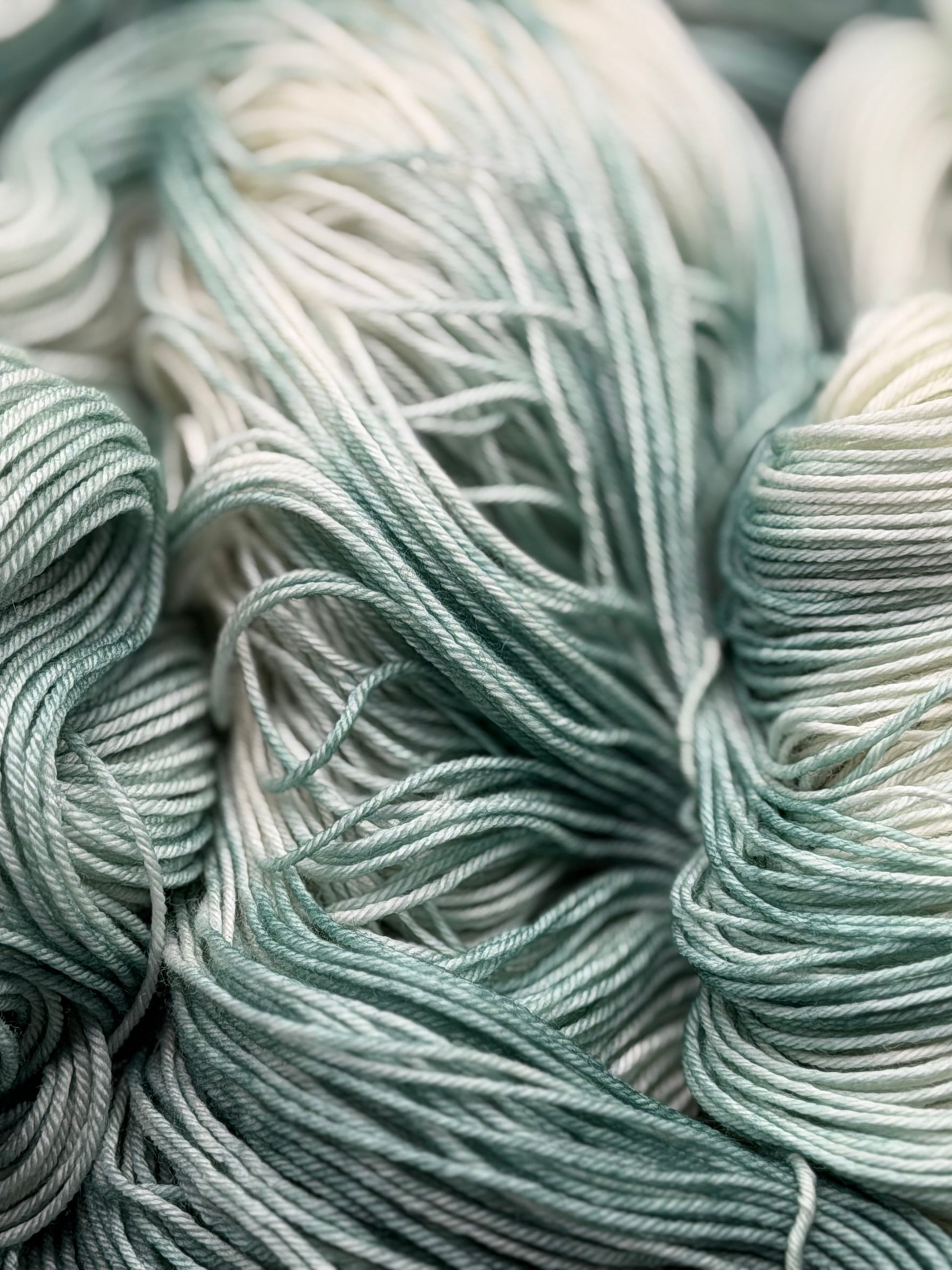 Sea Foam drifts in soft, quiet layers—muted green melting into pale mist like waves dissolving at the shoreline. It feels calm but never still, like the ocean holding its breath between tides. There’s a subtle depth beneath the softness, a whisper of salt air and cool mornings by the water. Hand dyed in small batches, each skein carries that effortless, worn-in serenity—fresh, fluid, and endlessly soothing.
