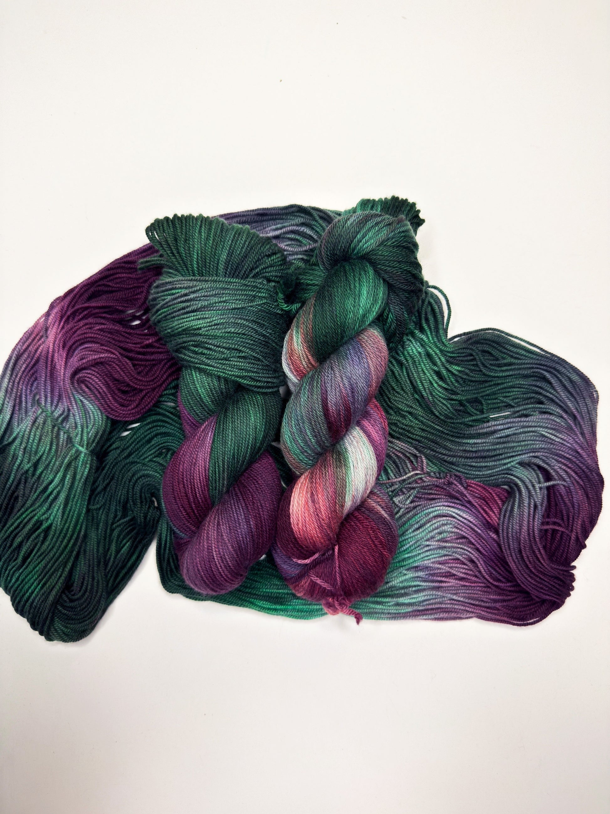 Dyed by hand in small batches, this yarn is meant to feel cozy, grounded, and just a touch mysterious — perfect for projects that want depth, warmth, and a story woven right in.